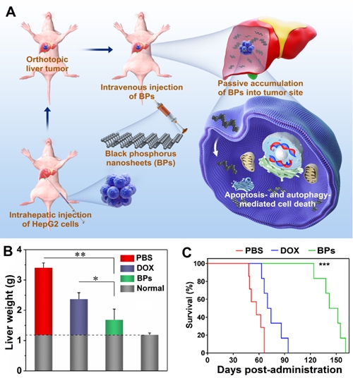 图1. 黑磷纳米片对原位肝肿瘤的治疗作用。(A)示意图;(B)治疗结束后,不同组别的肝肿瘤重量;(C)生存曲线。