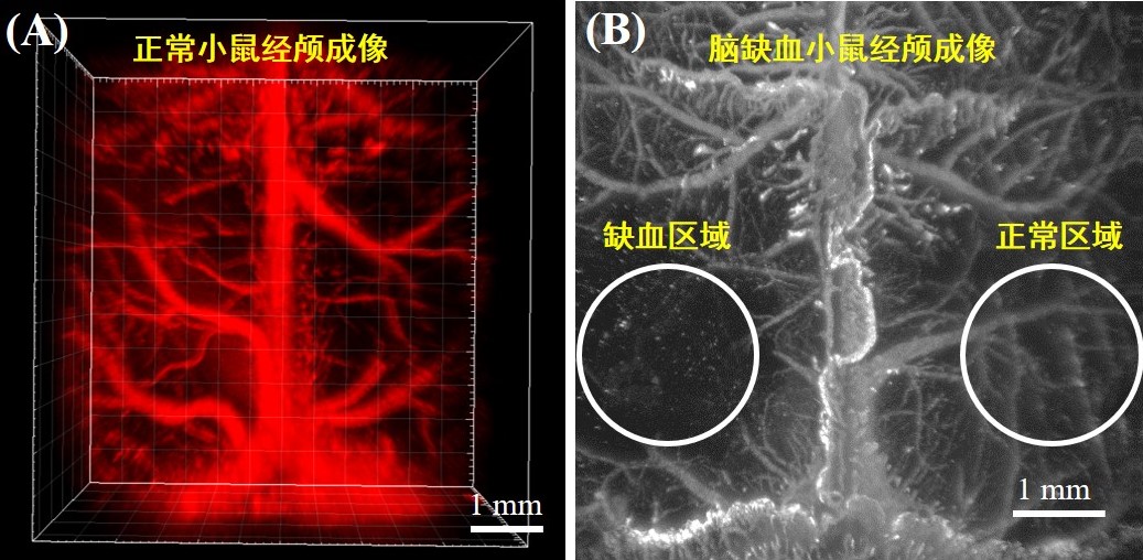 图1 NIR-II介观成像结果。(A)正常小鼠大脑经颅三维成像结果;(B)脑缺血小鼠大脑经颅三维成像最大强度投影图。