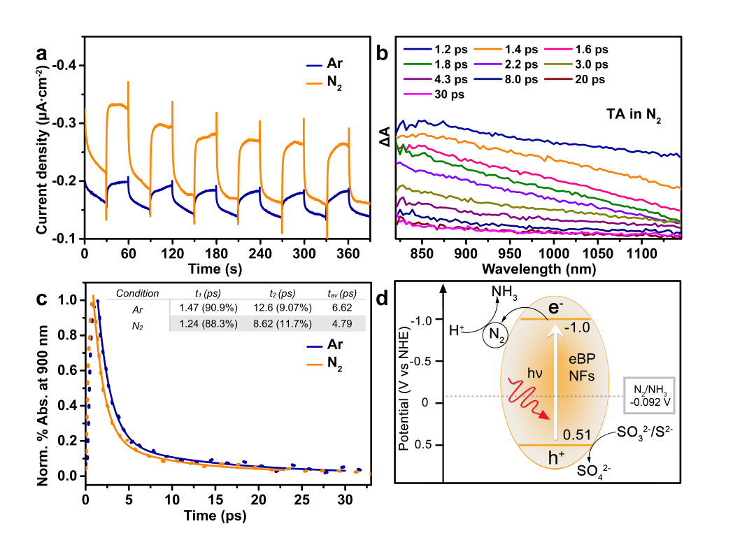 课题组进一步对多晶黑磷催化体系的机理进行了研究(如图3),在PEC测试中,多晶黑磷纳米片在氮气氛围中的响应要明显的强于在氩气氛围中;而在TA测试中,多晶黑磷纳米片的信号在氮气氛围中的衰减时间也明显的短于在氩气氛围中,两个实验结果都证实了氮气从多晶黑磷表面夺取光生电子的过程。此外,传统的晶体生&液相剥离法相比,本项研究中开发的球磨&化学刻蚀法大幅降低了制备黑磷纳米材料的成本和时间,这种价格低廉且高效的方法展现了黑磷纳米材料未来在工业化生产上的巨大的潜力。