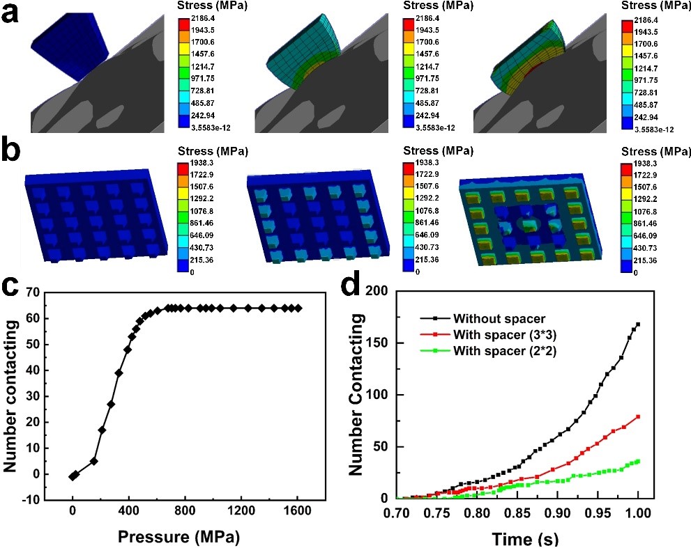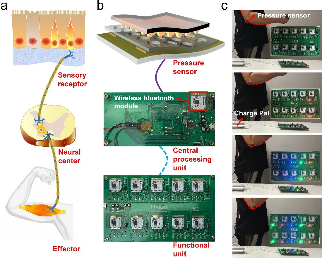 研究人员利用传统微纳加工工艺、真空镀膜技术和激光划线工艺制备出顶部为微圆台结构的聚二甲基硅氧烷(PDMS)/掺铝氧化锌(AZO)、间隔层为光刻胶(PS)和底部叉指电极为聚酰亚胺(PI)/金(Au)的柔性压力传感器。所制备的器件拥有高达2200 kPa-1的灵敏度、宽达9.6 kPa的动态线性量程范围,快至低于20 ms的上升和下降响应时间等优异性能。研究人员还进一步从理论角度阐明了器件在外界压力作用下的工作机理和内在压力分布,解释了PS间隔层中空穴直径大小、导电层微结构与最终器件灵敏度、动态线性量程范围和灵敏阈值等性能的关系。近日,上述研究成果以"High-performance zero-standby-power-consumption-under-bending pressure sensors for artificial reflex arc"为题发表在知名能源期刊Nano Energy(DOI: 10.1016/j.nanoen.2020.104743,IF=15.548)上。