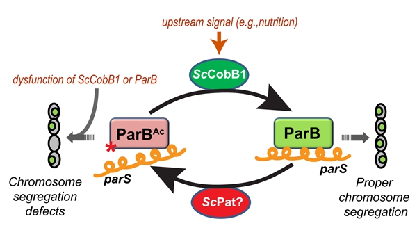 细菌染色体的分离过程调控机制长期以来并不清楚,已知由ParA、ParB蛋白和染色体类着丝粒parS组成的染色体分离复合物在染色体分离起始过程中起关键作用。研究团队通过蛋白质组学分析的方法,首先发现乙酰化修饰富集在细菌染色体分离通路,进而揭示ParB对类着丝粒parS位点的结合活性受乙酰化修饰调控。调控细胞乙酰化修饰水平包括两个关键酶:乙酰化酶ScCobB1和乙酰转移酶ScPat。研究比较分析了ParB蛋白在不同的乙酰化修饰水平下DNA结合力的改变。生化研究结果发现,乙酰转移酶ScPat能够乙酰化ParB蛋白并降低DNA结合力;相反,去乙酰化酶ScCobB1能去除ParB蛋白的乙酰化修饰,同时上调ParB-parS结合水平(图1)。