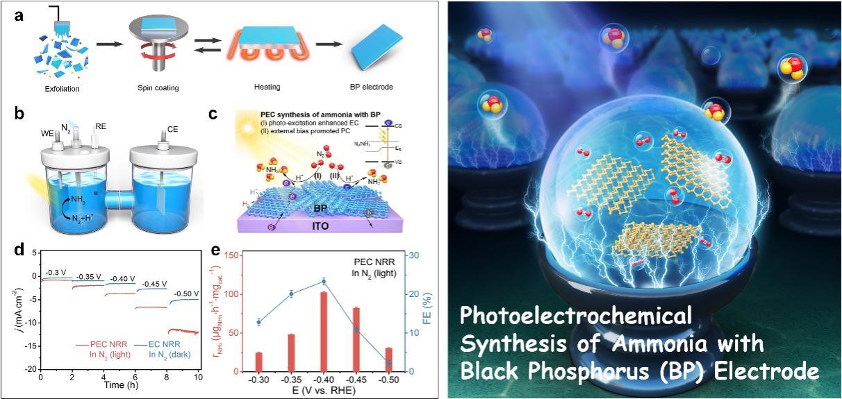 氨是工农业生产中重要的化学原料,也是一种新型的富氢能源载体。目前氨的合成主要通过Haber-Bosch法在高温高压下(350-550℃,150-350 atm)进行,耗能较高并伴随着大量的温室气体排放。因此,绿色环保的以氮气和水为原料的常温常压固氮合成氨技术获得了广泛关注。融合了电催化和光催化过程的光电化学技术则为常温常压固氮合成氨提供一个更加高效的技术平台。黑磷作为一种二维直接带隙半导体,具有光响应范围广、载流子迁移率高、边缘活性位点丰富、和氢吸附较弱等众多优点,在光电协同固氮合成氨方面展现出极大的潜力。