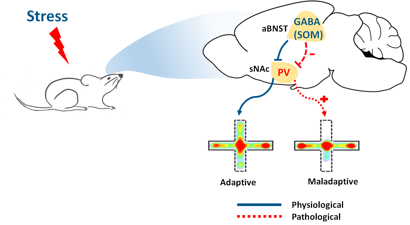 随着社会的变迁,生活节奏的加快,人们面临越来越多的压力应激。压力应激是应对环境变化的一种生理适应性反应,但是长期暴露则会产生病理改变,导致焦虑症甚至抑郁症等出现。然而,目前针对压力应激引起的焦虑样行为的大脑神经环路的机制尚不清楚。 越来越多的临床证据表明,焦虑症和成瘾是两类高度并发的精神疾病,但是其内在的神经环路机制一直没有被彻底研究。终纹床核(Bed Nucleus of the Stria Terminalis , BNST)是压力应激反应中的关键脑区。最近有关人的成瘾研究证明了BNST在戒断相关的焦虑和复吸中的作用,提示该压力反应脑区和大脑奖赏系统之间存在内在联系。伏隔核(Nucleus accumbens, NAc)是奖赏系统中的重要组成部分,它会对压力应激作出响应,并在焦虑调节中起主要作用。