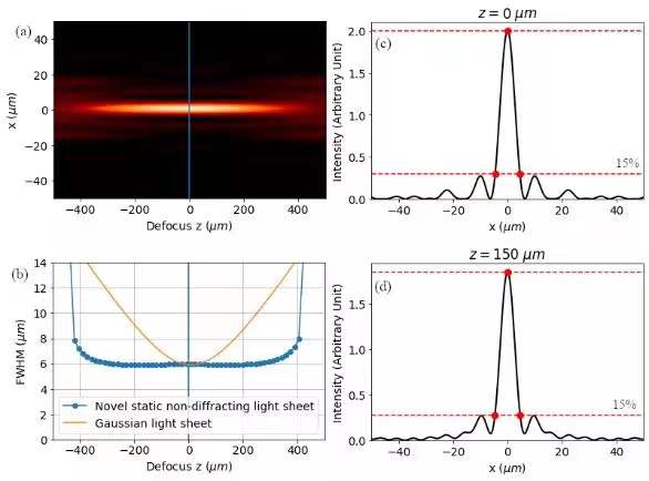 然而,光片显微术的成像性能受限于光片的光学属性,其成像分辨率受限于光片的厚度,成像视场受限于光片的宽度。而光片的厚度和宽度因光波固有的衍射属性相互制衡。薄光片支持高分辨率,但衍射发散快、有效宽度窄,限制了成像视场;厚光片衍射发散慢,支持大视场成像,但限制了分辨率。光的衍射属性导致成像分辨率和视场构成一对天然矛盾,限制了光片显微成像中生物个体的大小及表征通量。高分辨率大视场显微成像需要薄而宽的光片,这种光片具有无衍射性质。无衍射光片必然伴有旁瓣,旁瓣对成像构成离焦背景噪音。因而基于无衍射光片的显微荧光成像须控制旁瓣的影响。
