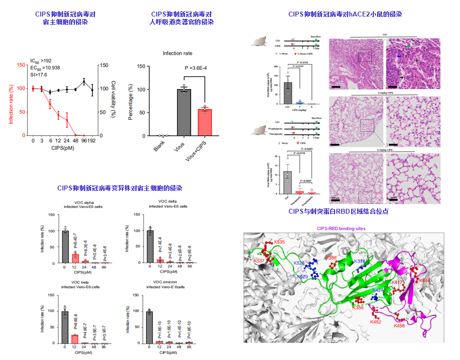 CIPS能够有效抑制新冠病毒及其变异株对宿主细胞、人呼吸道类器官及小鼠肺部的侵染,缓解新冠病毒诱导的肺部炎症;CIPS通过占据的刺突蛋白RBD区域与宿主ACE2受体结合的氨基酸位点,实现抗病毒功能