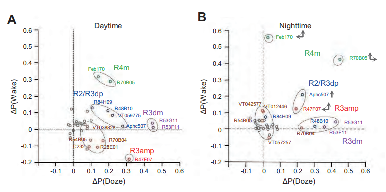 首先,团队成员利用混合高斯模型的方法对睡眠压力P(doze)和睡眠深度P(wake) [20] 进行聚类分析,通过对空间分布上睡眠深度和压力有类似影响的品系加以聚类,鉴定出调控睡眠的5个群组,且在白天和夜晚调控功能的动态变化趋势(图2)。进一步对这些群组的椭球体环状神经元亚型的分析,发现每个群组中可汇聚出协同发挥功能的环状神经元亚型。在白天(图2A),R4m具有较高的P(wake)值,强有力地调节睡眠深度/觉醒;R3dm呈现出强的睡眠驱动力,增加入睡的可能性。尽管R2/R3dp神经元在白天没有出现对睡眠深度和驱动有独特的功能,但夜晚显示出其促醒的功能(图2B)。在夜晚,R3amp亚型(以R47F07-GAL4品系为代表)促醒的趋势较白天更为显著,而不同的R4m分别增强了睡眠压力(以R70B05-GAL4品系为代表)或者降低了睡眠深度(以Feb170-GAL4品系为代表)(图2B)。