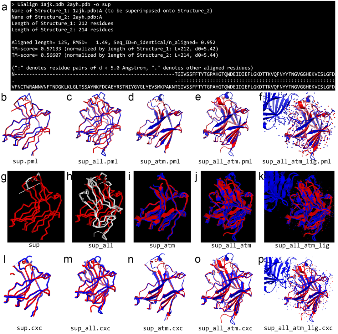 图4. US-align命令行程序两两比对结果(a)在PyMOL(b-f)、RasMol(g-k)与UCSF ChimeraX(l-p)分子可视化程序中不同风格的三维结构展示。