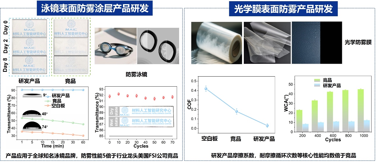 依托上述技术,喻学锋、杨帆团队已快速构建从材料设计、性能预测到涂层工艺优化的完整智能研发体系,并形成多项涂层技术和产品,已获得10多项发明专利授权。相关技术已在高端光学系统、电子设备界面防护、精密传感器件、AR/VR光学模组、幕墙系统等场景进行验证,在复杂温湿度环境下可有效抑制界面凝露对系统性能的影响,提升光学路径稳定性与长期可靠性。团队与华凯体育合作,构建了面向游泳眼镜产品的全新光固化涂层技术体系,成功开发了百次循环无雾的先进光学涂层,性能5倍于防雾涂层行业龙头美国公司竞品,产品已应用于全球知名运动品牌。