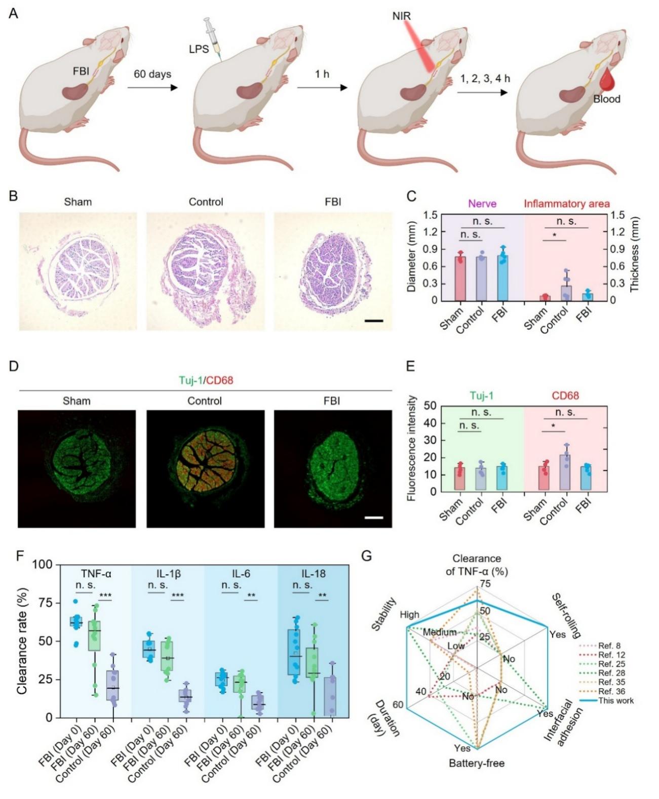 该FBI由三层功能材料协同整合而成,共同赋予其自卷曲、免缝合和仿生电信号输出的多重功能(图1)。其中,底层由具有优异生物相容性的壳聚糖和海藻酸钠天然多糖构建的双层水凝胶基底,在遇水后可自动卷曲成管,精准包裹直径仅约0.5毫米的细小神经,实现无缝贴合;与此同时,水凝胶表面的活性基团可与神经组织表面形成氢键和共价键,提供约50千帕的粘附强度,使器件无需缝合即可牢固固定于神经表面。位于器件上层的聚偏氟乙烯-三氟乙烯铁电高分子与碳纳米管复合条带(CNT/P(VDF-TrFE)),则可在近红外(NIR)光照射下发生偶极子取向偏转,从而产生与天然神经元极化变化所诱导动作电位相似的仿生电信号。基于此,该FBI能够通过NIR遥控,有效刺激神经细胞响应;与传统硅基光电材料相比,其诱发的细胞毒性活性氧水平降低了16倍。在活体实验中,FBI可自动卷曲包裹大鼠迷走神经并实现自粘合,通过激活胆碱能通路进而有效降低血清中促炎细胞因子水平。植入自由活动的大鼠体内长达60天后,FBI不仅未出现移位、神经压迫和局部炎症,而且仍能保持与植入初期一致的抗炎效果。值得强调的是,FBI通过多功能融合,有效解决了传统神经刺激器与神经组织长期存在的界面失配问题,不仅为迷走神经刺激治疗自身免疫疾病提供了更安全、持久的解决方案,其设计理念也有望推广至其他周围神经和中枢神经调控,以及脑机接口、组织工程等多个生物医学领域。