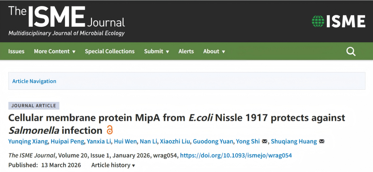 近日,中国科学院深圳先进技术研究院定量合成生物学全国重点实验室、合成生物学研究所合成生物进化研究中心黄术强团队与宁波诺丁汉大学石泳团队合作,在国际微生物生态学会期刊The ISME Journal上发表了题为“Cellular membrane protein MipA from E.coli Nissle 1917 protects against Salmonella infection”的研究成果。
