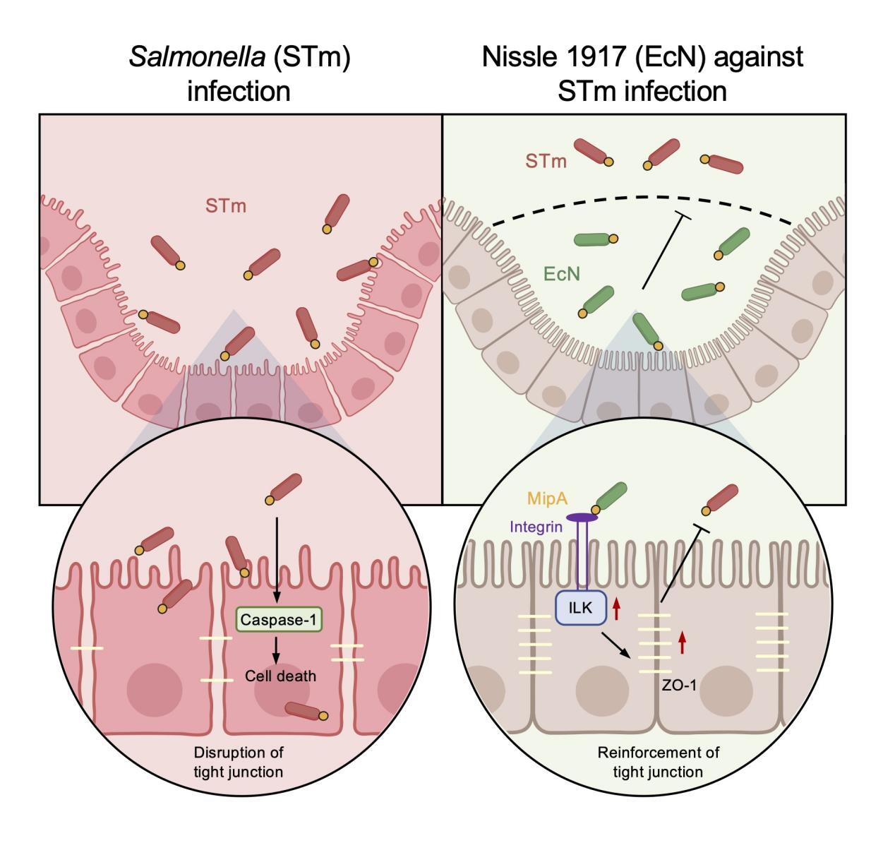 本研究通过体内动物模型、仿生肠道芯片与定量蛋白质组学等技术,阐明了益生菌调控宿主抵御病原菌入侵的作用机制。研究发现,益生菌并非被动地等待病原菌攻击后再行修复,而是通过其外膜蛋白MipA主动调控宿主上皮细胞的ILK表达,从而先发制人地加固细胞间紧密连接,构筑起一道强化的防御屏障。这种主动加固的生态位防御策略,与先前报道的EcN在感染后修复已受损屏障的机制有所不同,体现了由益生菌驱动、通过调节宿主来增强其固有防御的生物学过程。