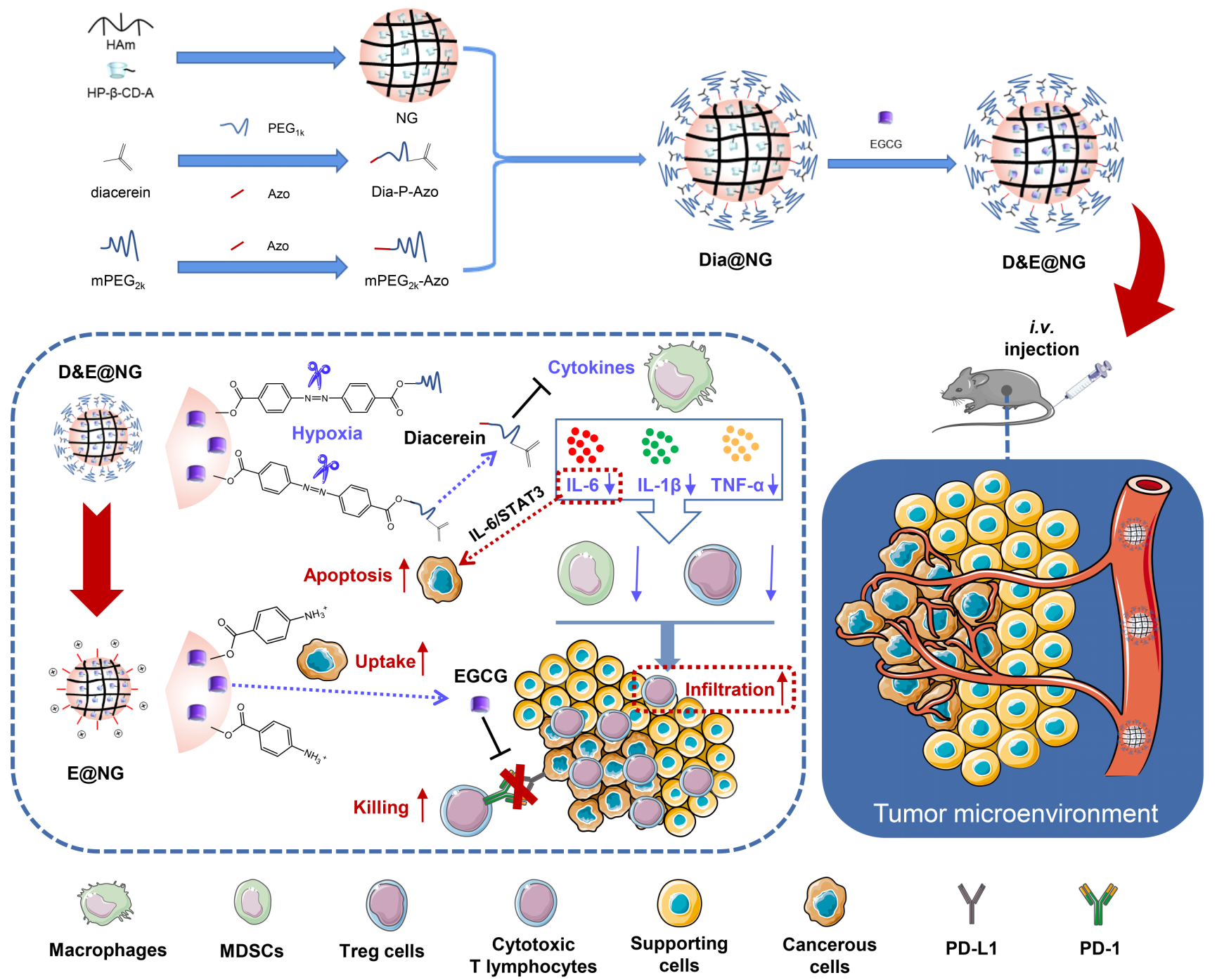 该研究构建了一种缺氧响应型纳米凝胶(NG),通过改善炎症肿瘤微环境,该纳米凝胶有效增加了CTLs在肿瘤中的浸润。同时,通过与TIM-3免疫检查点阻断治疗结合,进一步引发强烈的抗肿瘤免疫反应。