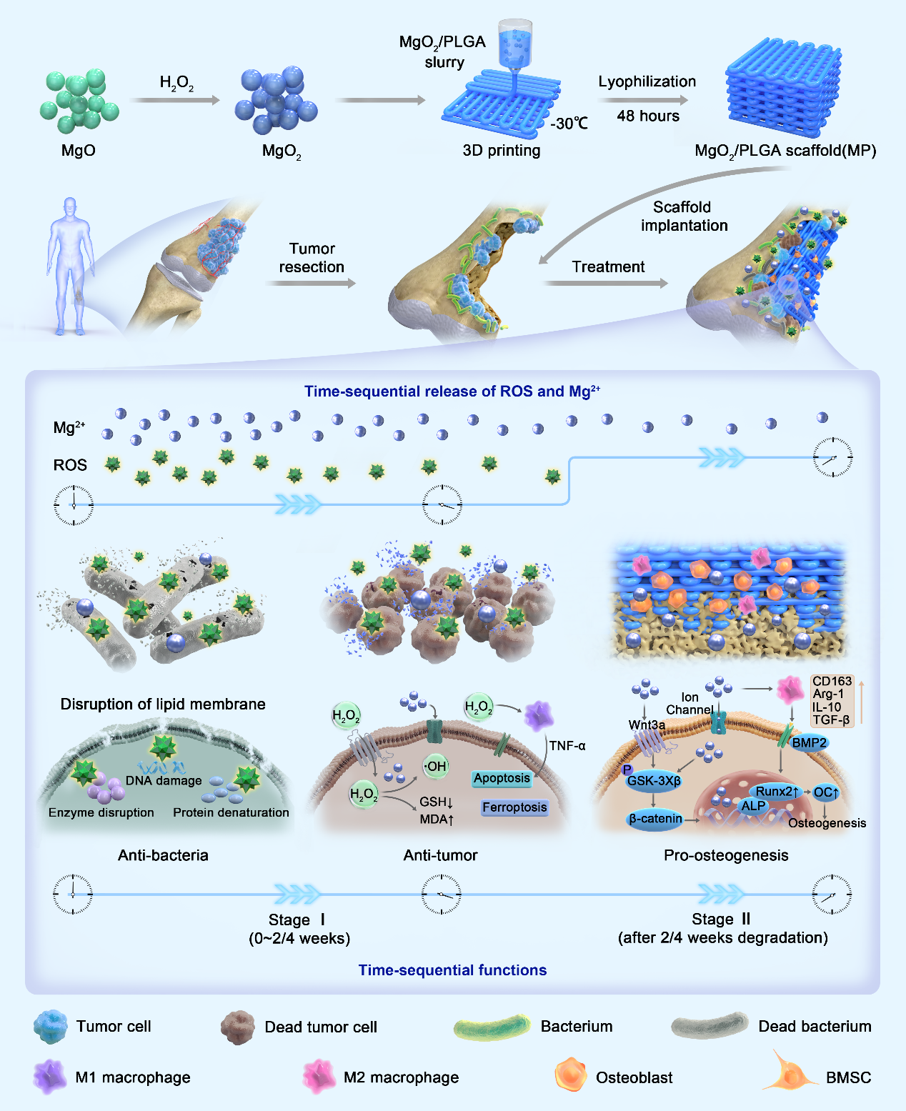 该支架可实现阶段性序贯控释镁离子(Mg2+)和活性氧(ROS),具有早期预防肿瘤术后复发、抑制细菌感染和长效促进骨缺损修复的时序性多功能。