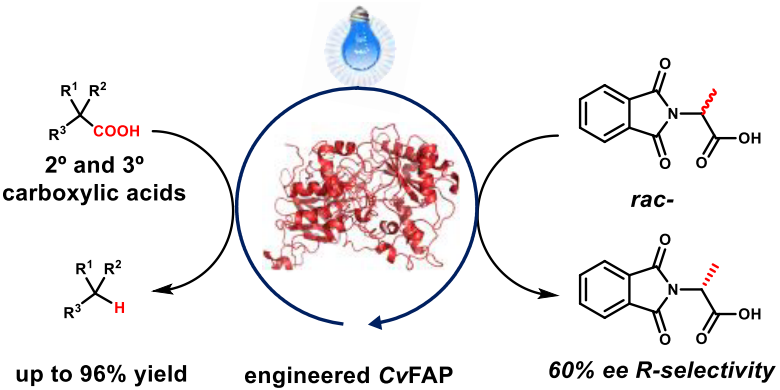 该研究通过对于光促脱羧酶FAP进行理性设计与定向进化改造,发展了一类新型的光促脱羧酶,实现了对于二级、三级等非天然底物的羧酸进行高效的光促脱羧转化,并应用于药物分子类似物的手性合成中。