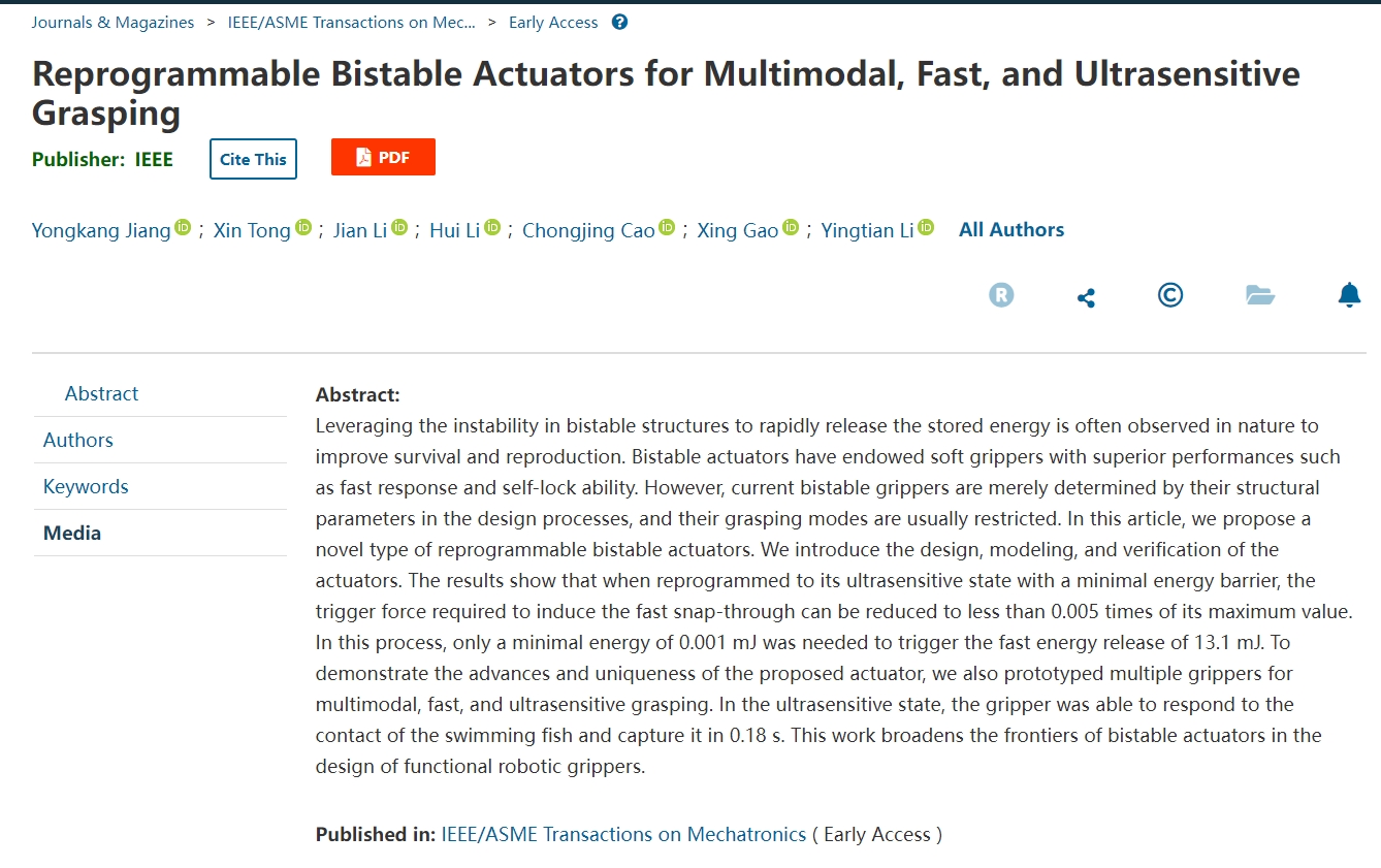 近日,中国科学院深圳先进技术研究院医工所微创中心李英田副研究员课题组,与同济大学、北京邮电大学在IEEE/ASME Transactions on Mechatronics上合作发表了题为Reprogrammable Bistable Actuators for Multimodal, Fast, and Ultrasensitive Grasping的文章。中国科学院为唯一完成单位,...