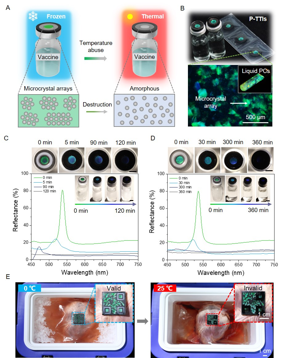 该研究报道了一种基于自毁型结构色液体的新型智能时间温度指示器 ,及其在各类疫苗、离体器官等医药冷链可视化监测方面的应用。