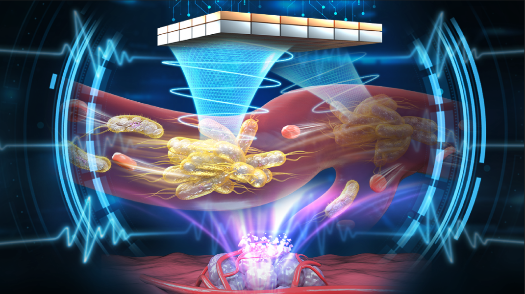 研究开发出一种相控阵全息声镊操控技术,在生物体及血流中成功实现了对含气囊细菌群的无创精准操控和高效富集,在动物模型中实现了肿瘤靶向治疗应用。