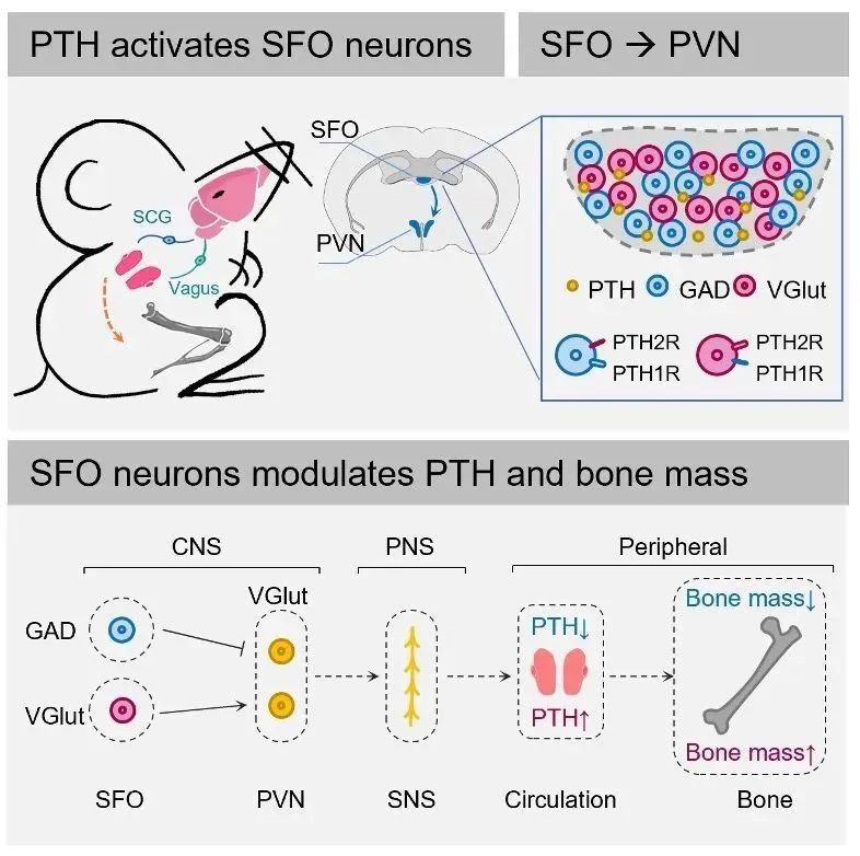 文章详细描述了小鼠的中枢神经系统穹窿下器官感受外周甲状旁腺激素,并通过下丘脑室旁核以及交感神经反馈调节外周PTH变化进而干预骨代谢的机制。
