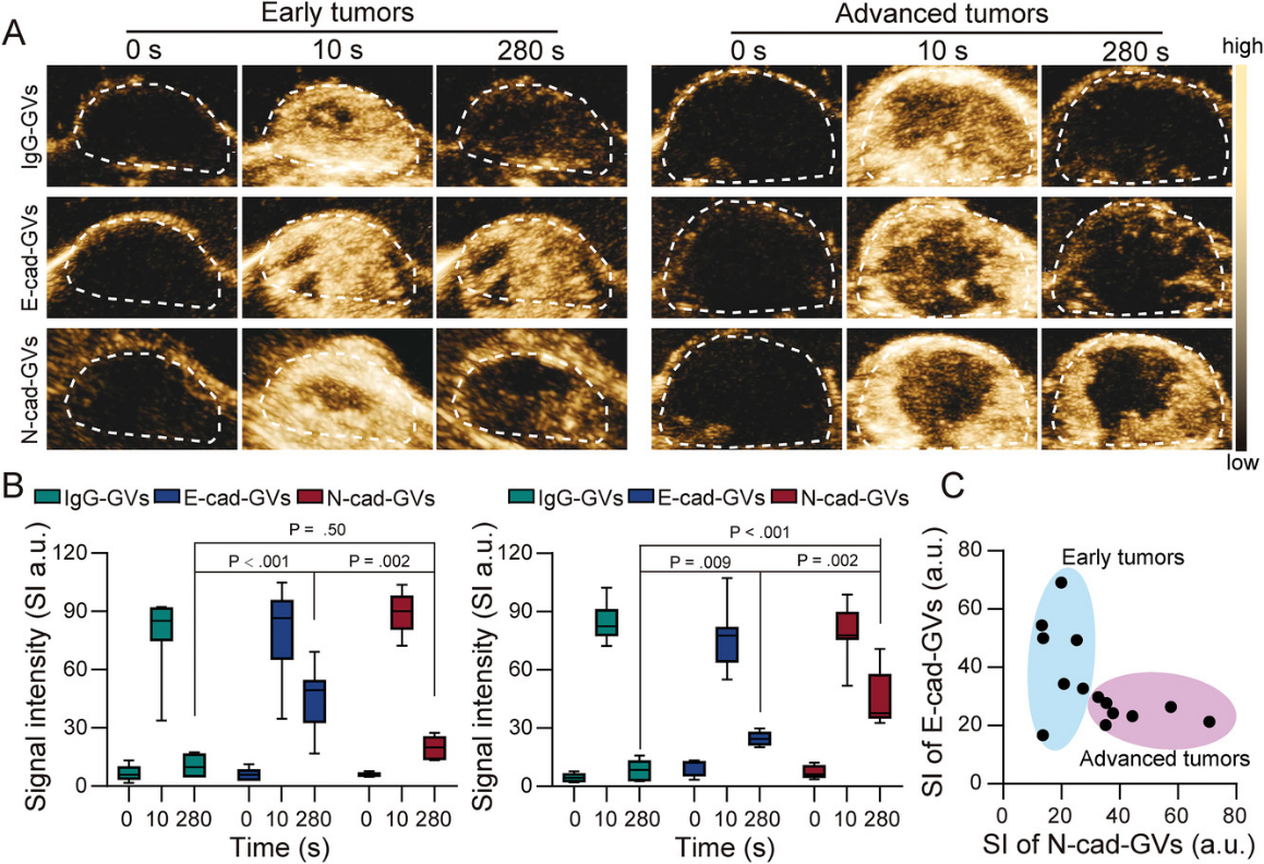 该工作利用生物合成的纳米气囊实现了对肿瘤上皮-间质转化(EMT)动态变化的超声分子成像,为评估肿瘤转移潜力提供了新方法。