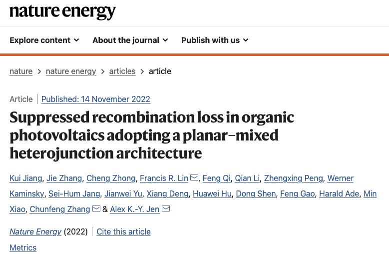 11月14日,中国科学院深圳先进技术研究院先进材料科学与工程研究所光子信息与能源材料研究中心的张杰副研究员课题组联合香港城市大学任广禹教授团队与南京大学张春峰教授团队合作在Nature Energy上发表题为“Suppressed recombination loss in organic photovoltaics adopting a planar–...