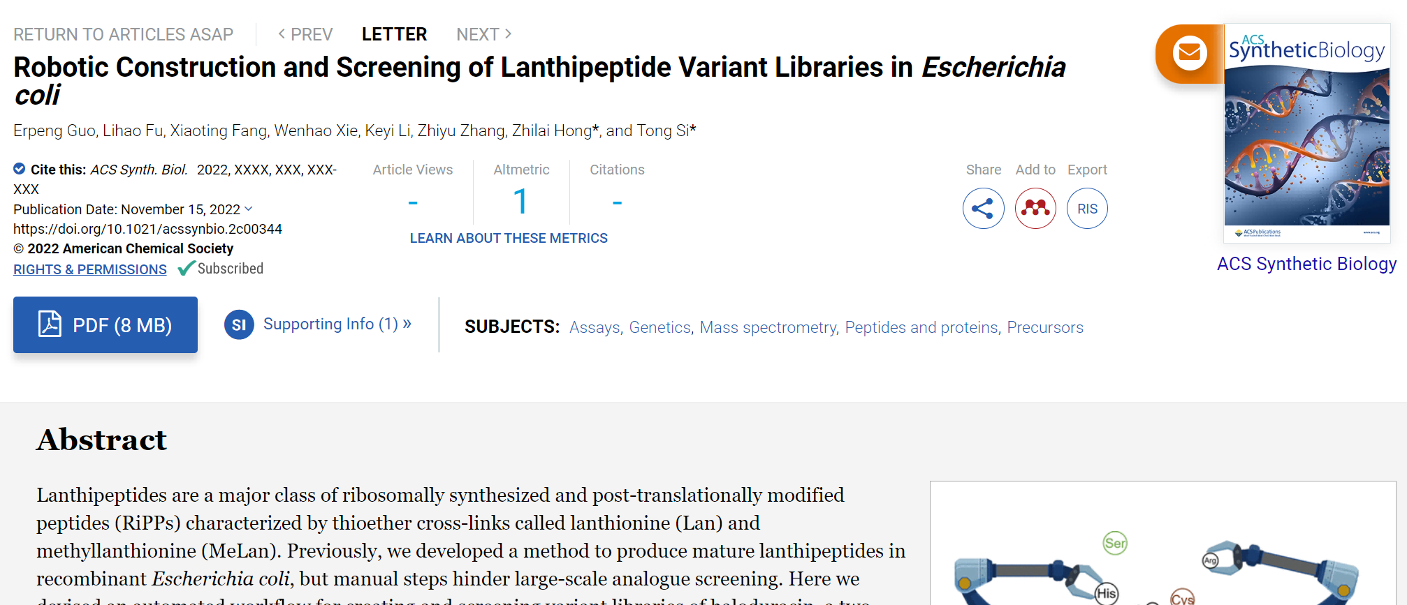 ACS Synthetic Biology | 深圳先进院合成所司同课题组对羊毛硫肽衍生物文库的自动化构建和筛选