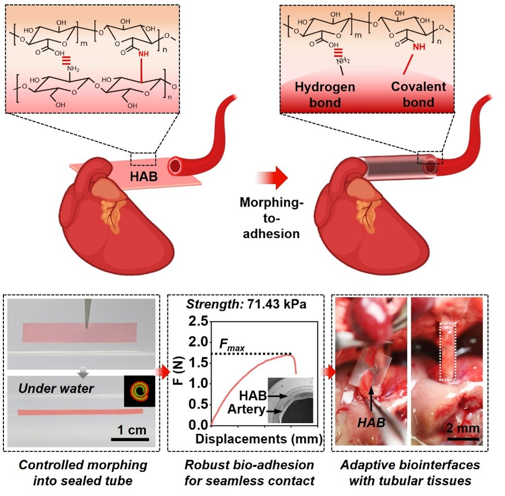 近日,中国科学院深圳先进技术研究院医工所智能材料中心杜学敏研究员团队与中国地质大学(北京)李金洪教授研究团队合作,设计构建了基于NHS酯修饰海藻酸钠和壳聚糖双层水凝胶的生物适配界面,可在湿润生理条件下程控卷曲成管并快速粘合,实现与表面高曲率组织如小口径血管的免缝合、共形...
