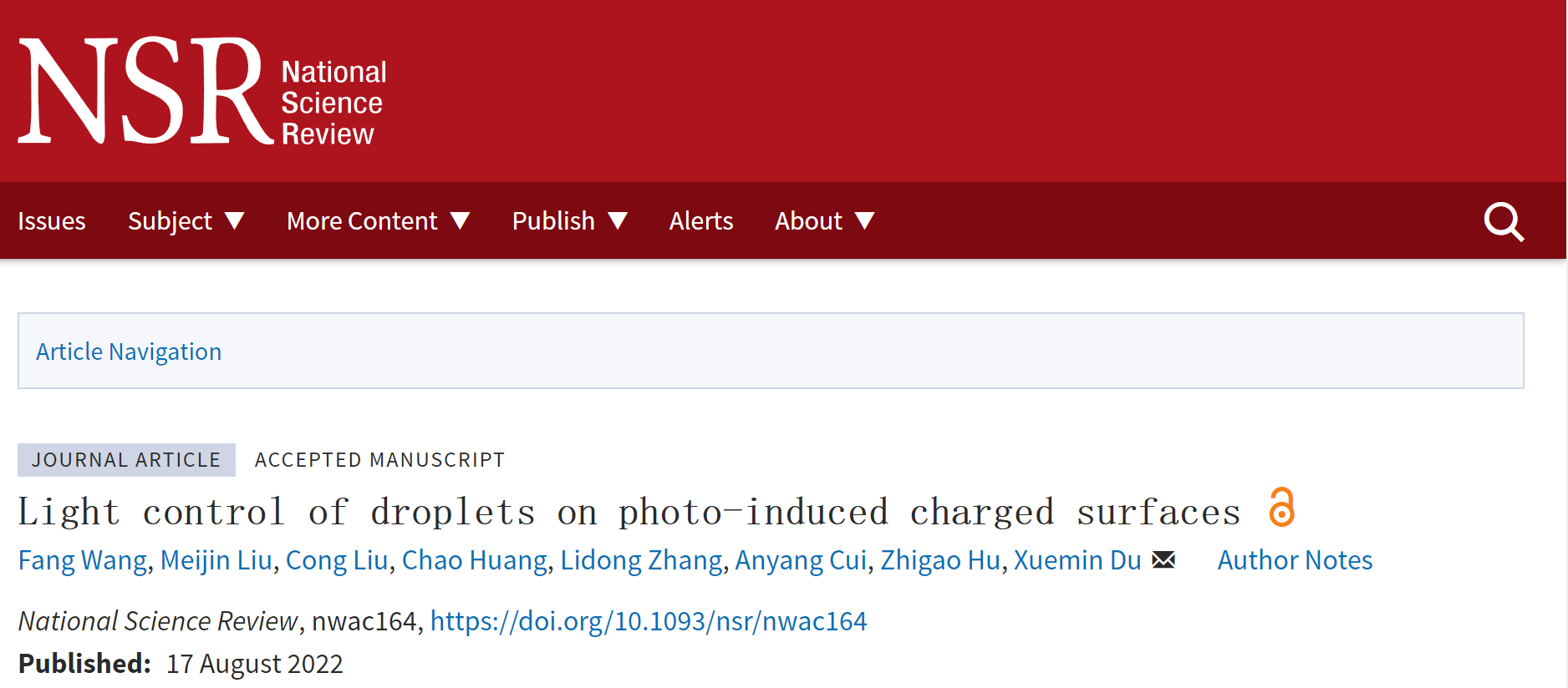 8月17日,中国科学院深圳先进技术研究院智能医用材料与器械研究中心杜学敏研究员团队,在光诱导带电的超双疏表面光控液滴及其生物应用方面取得重要进展,该研究成果以“Light control of droplets on photo-induced charged surfaces”为题发表在国际期刊National Science Review(IF...