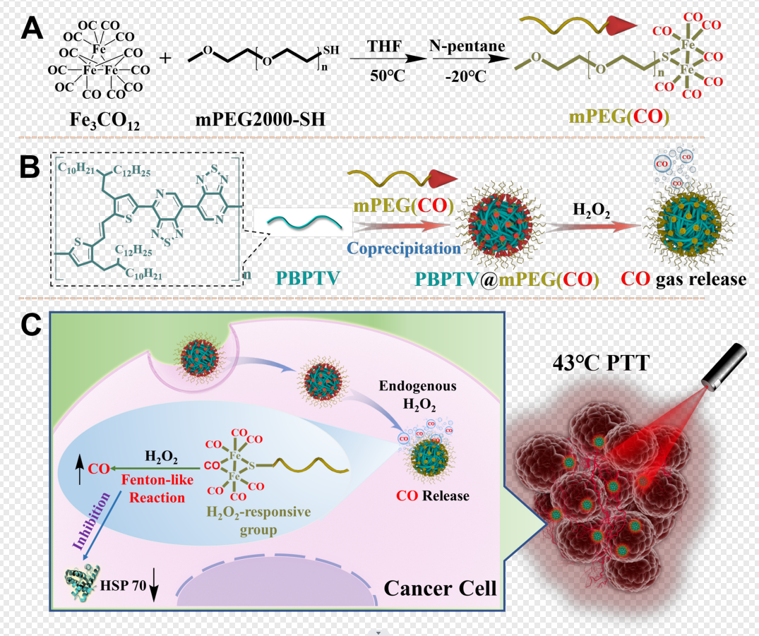 中国科学院深圳先进技术研究院医药所蔡林涛研究员团队与香港科技大学/香港中文大学(深圳)唐本忠院士团队合作,在前期研究基础上(ACS Nano 2020, 14, 9, 11452–11462),利用羰基铁合成了一种新型两亲性治疗气体载体材料(mPEG(CO)),通过与具有近红外二区发射的AIE聚合物光热材料进...
