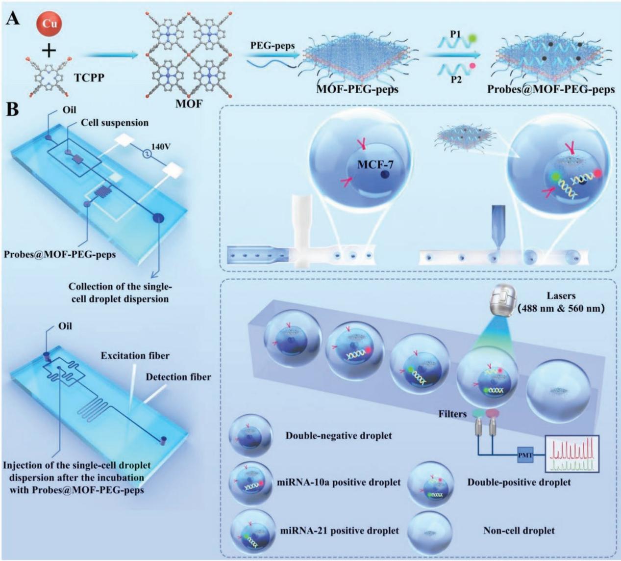近日,中国科学院深圳先进技术研究院陈艳团队联合清华大学深圳国际研究生院谭英团队、香港理工大学杨莫团队提出了一种新型的2D MOF纳米传感器集成的液滴微流控流式细胞仪(Nano-DMFC),可应用于CTC单细胞miRNA的原位多重检测。该研究工作以陈俊粤、格日乐为共同一作,以“2D MOF Nanosenso...