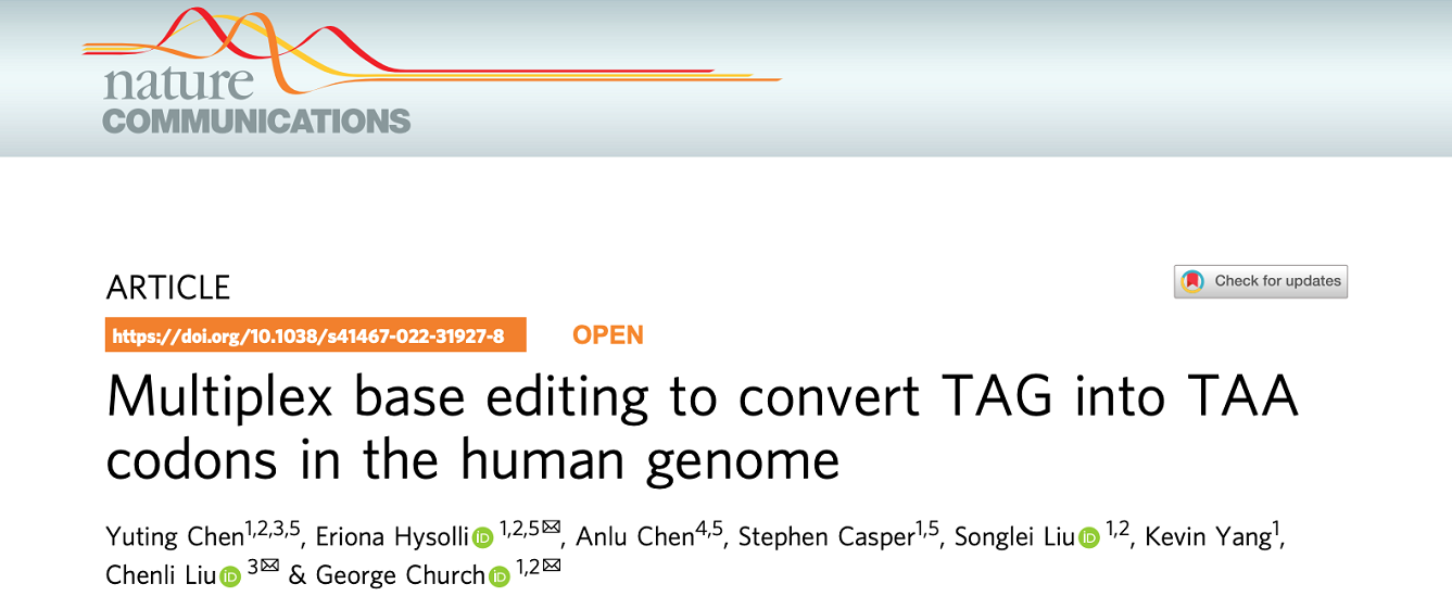 2022年8月2日晚,哈佛大学George Church教授团队、中国科学院深圳先进技术研究院合成生物学研究所刘陈立研究员团队在Nature Communications上发表了题为《Multiplex base editing to convert TAG into TAA codons in the human genome》的文章。