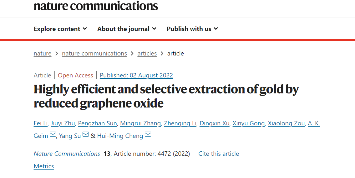 该研究工作以“还原氧化石墨烯高效、选择性提取金”(Highly Efficient and Selective Extraction of Gold by Reduced Graphene Oxide)为题发表在国际著名期刊《自然·通讯》(Nature Communications)上。