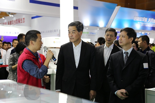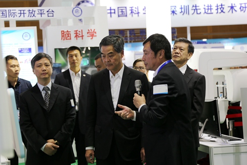 11月18日下午,全国政协副主席、香港特别行政区前行政长官梁振英出席第十九届中国国际高新技术成果交易会(简称“高交会”)期间,来到中国科学院深圳先进技术研究院展区参观。深圳市政协主席戴北方等陪同参观,先进院党委书记杨建华,院长助理、产业合作与发展处处长毕亚雷迎接来宾一行。