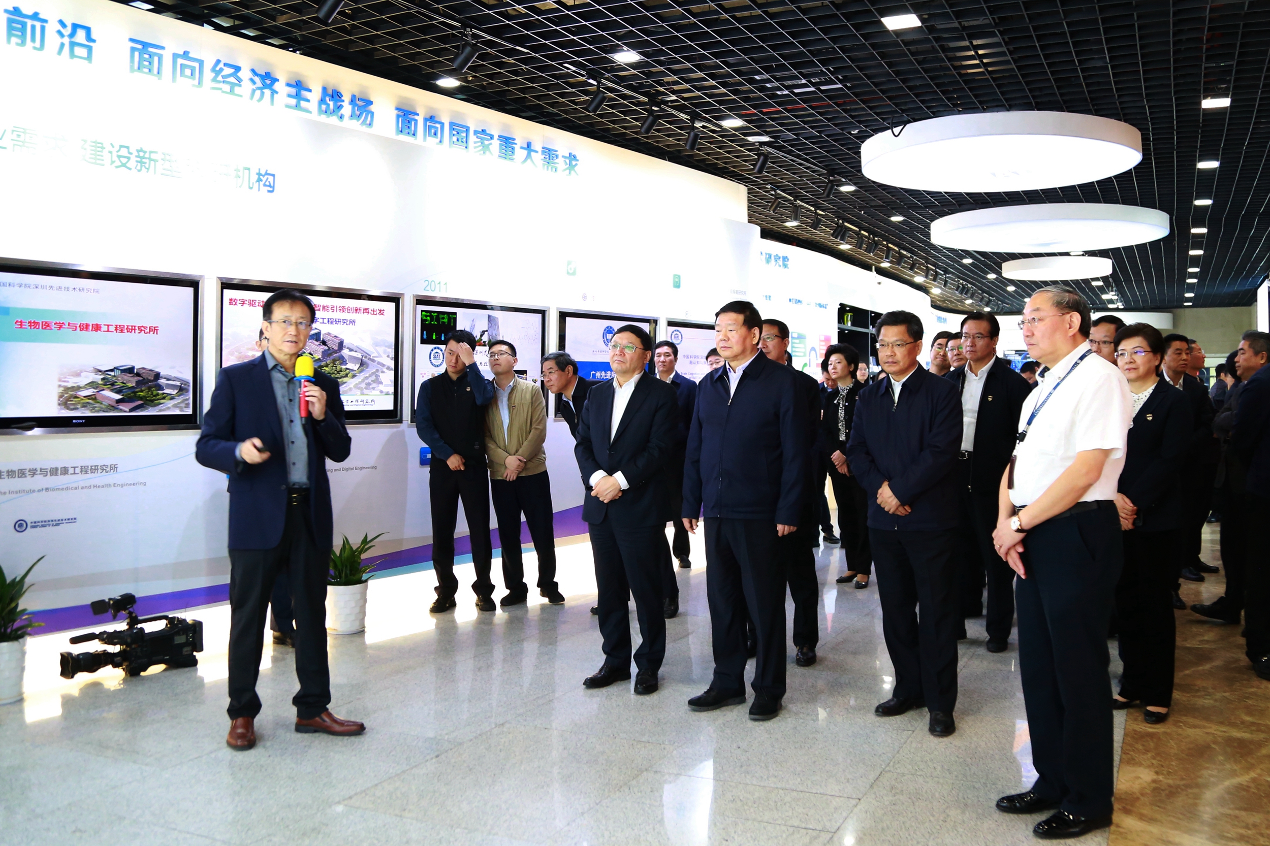 江苏省省委书记、省人大常委会主任娄勤俭(前排中),广东省委副书记、深圳市委书记王伟中(前排左一)一行听取深圳先进院发展情况汇报