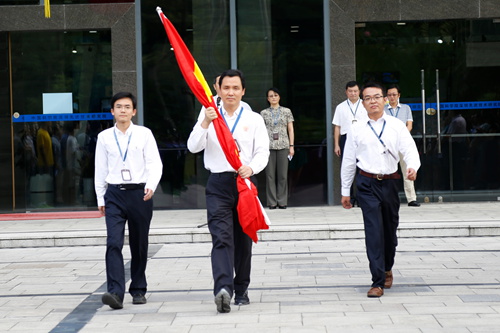 此次升旗仪式由王立平博士(中)担任旗手,宋亮博士(左)和李志成博士担任护旗手