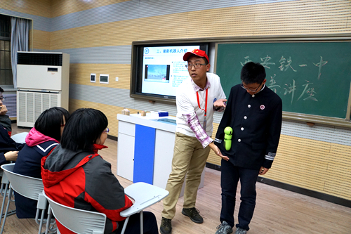 先进院科普志愿者在西安市铁一中学演示爬衣机器人