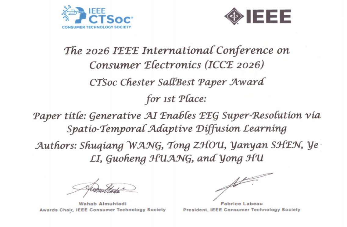 近日,中国科学院深圳先进技术研究院数字所生物医学信息中心王书强、李烨研究员团队联合香港大学胡勇教授合作完成的“生成式AI赋能BCI信号增强”项目获得2025 IEEE Chester Sall Award一等奖。