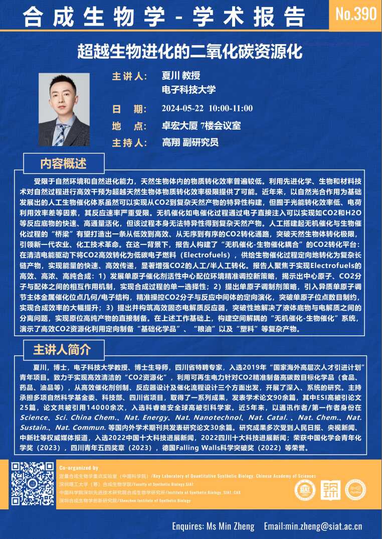 合成所/合成生物学院第390期学术讲座将于 5月22日(星期三) 10:00-11:00 在 卓宏大厦 7楼会议室 举行。