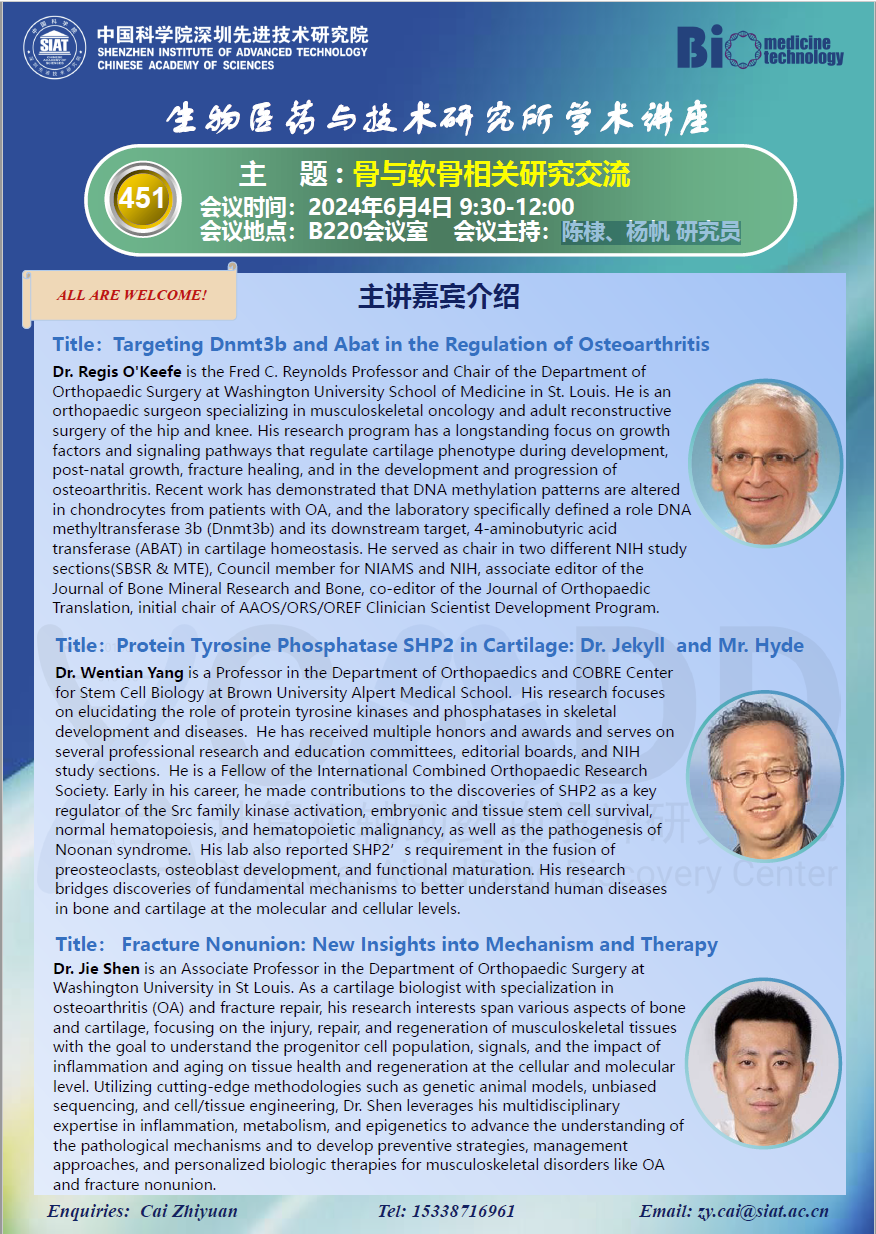 大家好! 医药所第451期学术讲座将于2024年6月4日 星期二 9:30-12:00 B220 会议室举行。本次讲座邀请了来自布朗大学 Wentian Yang 教授, 圣路易斯华盛顿大学 Regis O'Keefe 教授 & Jie Shen 教授 围绕“骨与软骨相关研究交流 ”展开探讨。届时,陈棣、杨帆研究员将主持讲座。