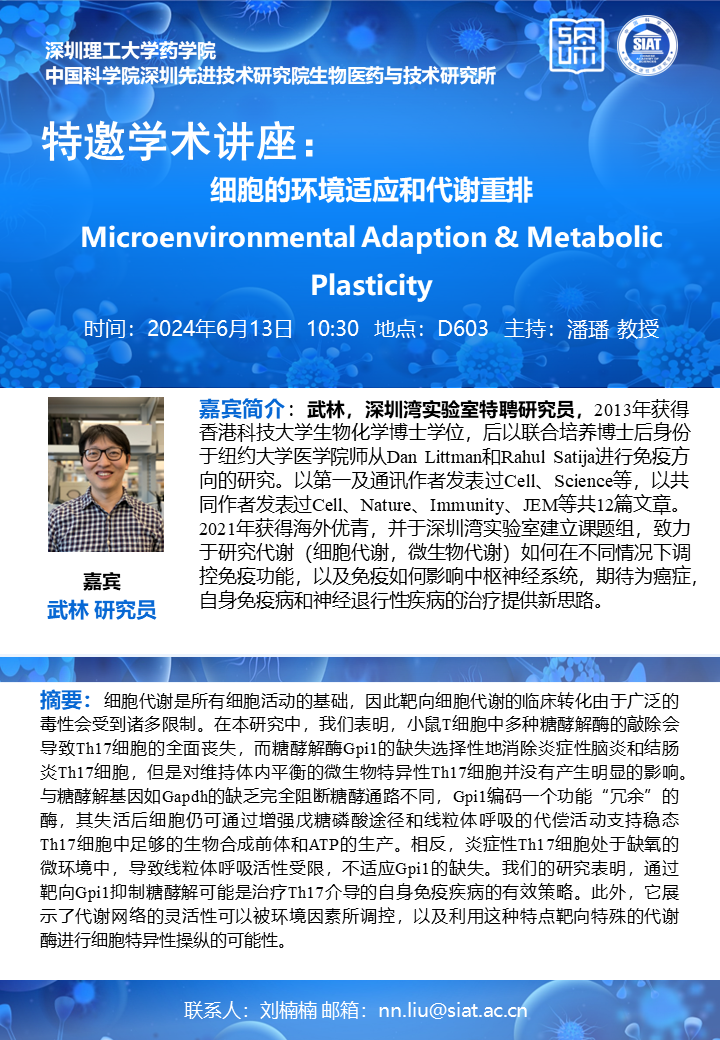 大家好!药学院/医药所“特邀学术讲座”系列将于2024年06月13日(周四)10:30,在先进院D603会议室举行。本次讲座邀请了来自深圳湾实验室的武林 研究员带来中文题为“细胞的环境适应与代谢重排”/英文题为“Microenvironmental Adaption & Metabolic Plasticity”的报告。届时,潘璠 教授将主持讲座。