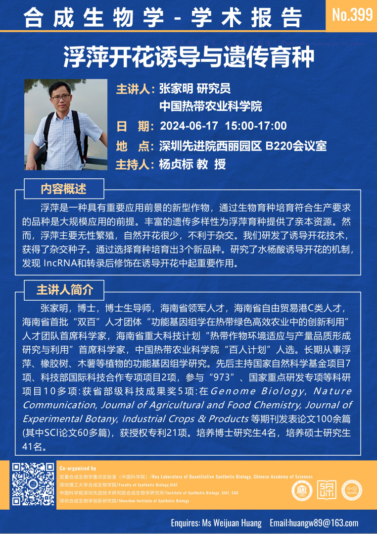 各位老师、同学、同事: 大家好! 合成所/合成生物学院第399期学术讲座将于 6月17日(星期一)15:00-17:00 在 深圳先进院西丽园区 B220会议室 举行。