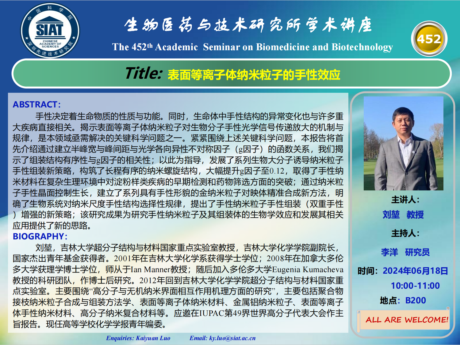 大家好! 医药所第452期学术讲座将于2024年6月18日 星期二 10:00-11:00 B200 会议室举行。本次讲座邀请了来自吉林大学 刘堃 教授带来“表面等离子体纳米粒子的手性效应 ”的报告。届时,李洋 研究员将主持讲座。