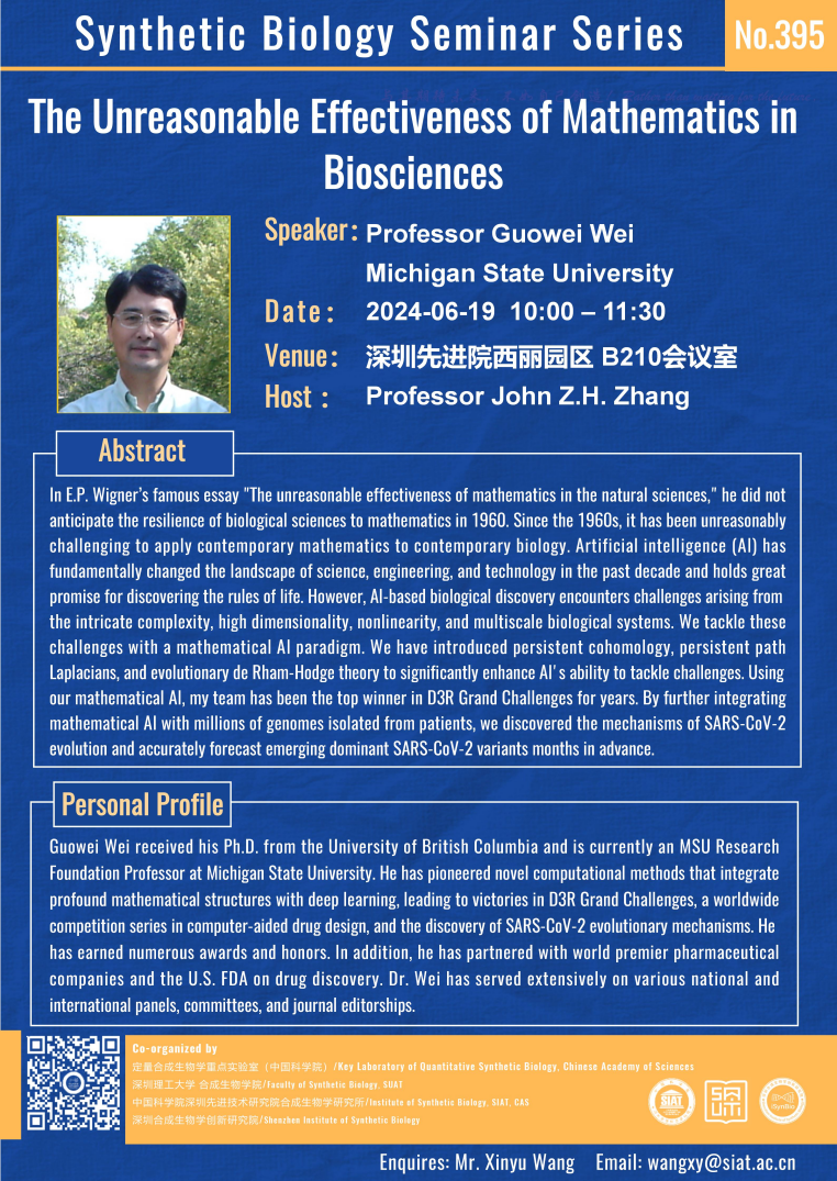 本次讲座邀请了 密歇根州立大学 Professor Guowei Wei 带来题为“The Unreasonable Effectiveness of Mathematics in Biosciences”的报告。