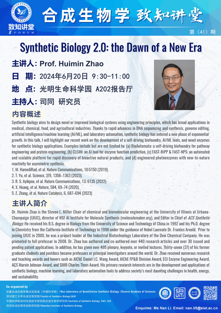深圳合成生物学创新研究院/合成生物学研究所/合成生物学院“致知讲堂”第四十一期 将于 2024年6月20日(星期四)9:30-11:00 在 光明生命科学园 A202报告厅 进行。