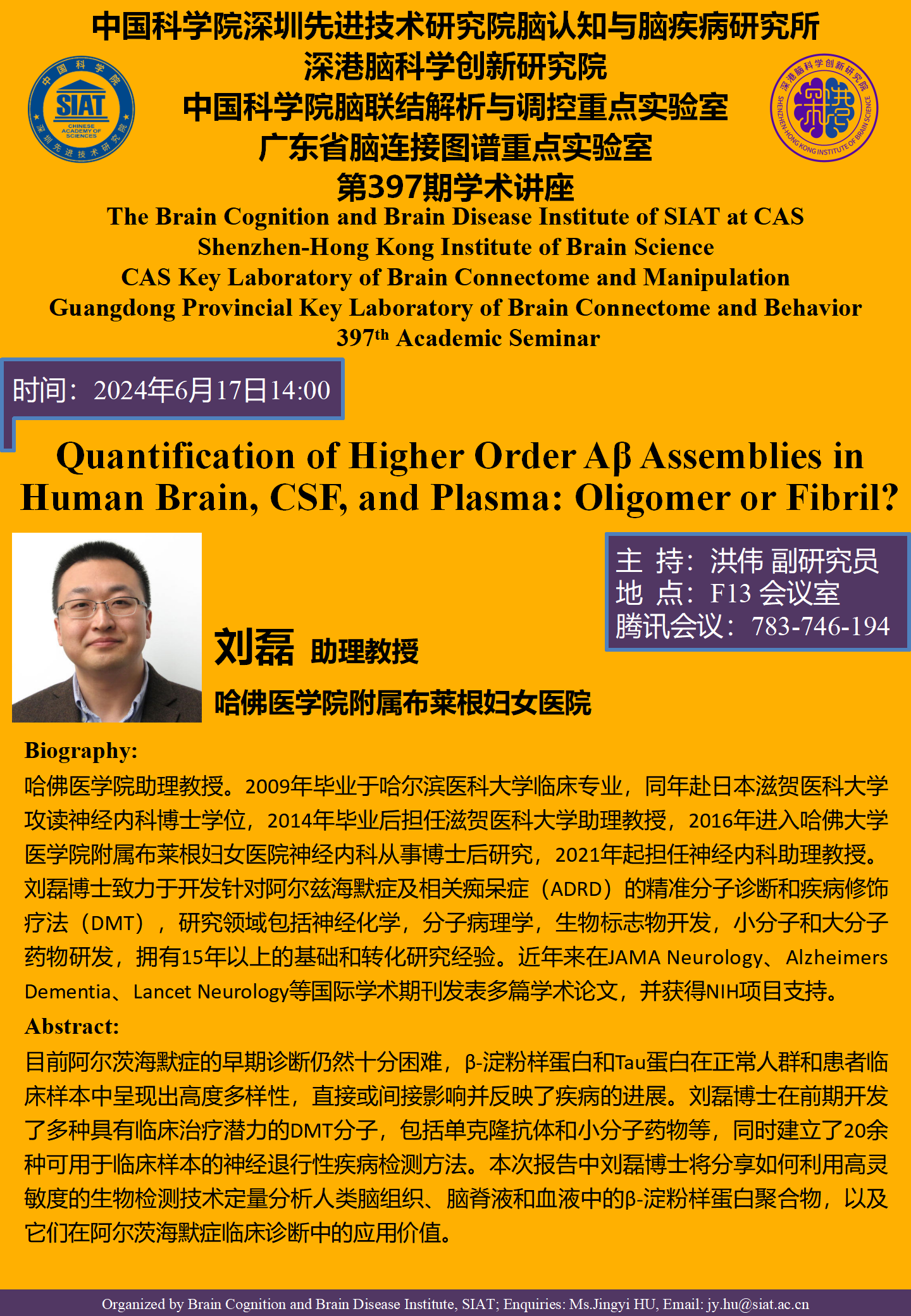 由哈佛医学院附属布莱根妇女医院 刘磊 助理教授,带来“Quantification of higher order Aβ assemblies in human brain, CSF, and plasma: oligomer or fibril?” 的专题报告。