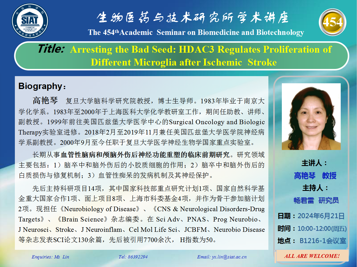 大家好! 医药所第454期学术讲座将于2024年6月21日 星期五 10:00-12:00 B1216-1会议室举行。本次讲座邀请了来自复旦大学 高艳琴 教授带来“Arresting the Bad Seed: HDAC3 Regulates Proliferation of Different Microglia after Ischemic Stroke”的报告。届时,畅君雷 研究员将主持讲座。