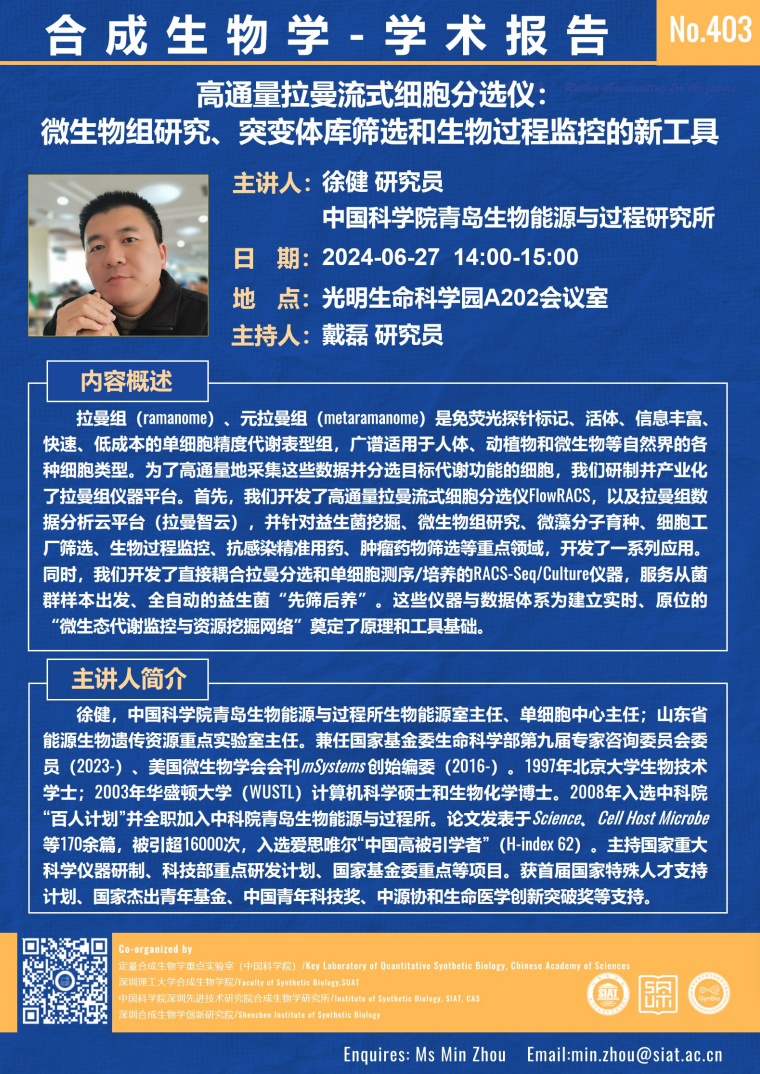 本次讲座邀请了 徐健 研究员 带来题为“高通量拉曼流式细胞分选仪:微生物组研究、突变体库筛选和生物过程监控的新工具”的报告。