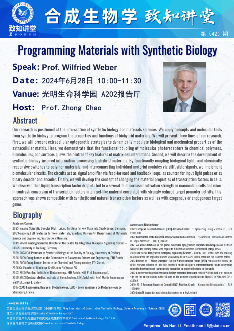 深圳合成生物学创新研究院/合成生物学研究所/合成生物学院“致知讲堂”第四十二期 将于 2024年6月28日(星期五)10:00-11:30 在 光明生命科学园 A202报告厅 进行。