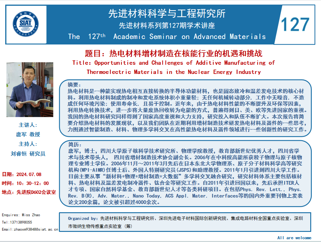 本次讲座邀请了 四川大学 唐军 教授 带来题为“热电材料增材制造在核能行业的机遇和挑战”的报告。