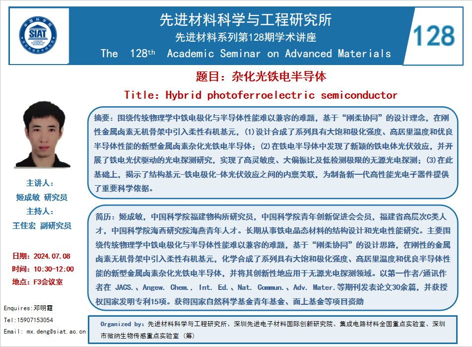 先进材料科学与工程研究所“先进材料系列”第128期学术讲座将于07月08日(周一)10:30-12:00,在F3会议室进行。