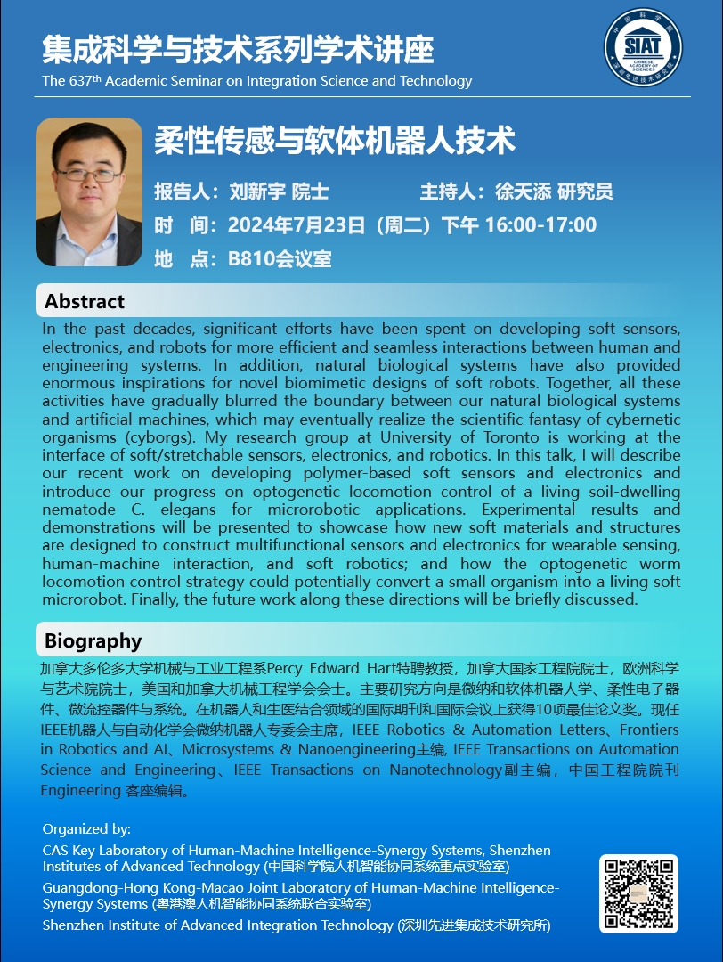 集成所第637期集成科学与技术系列学术讲座将于2024年7月23日(周二)下午16:00-17:00在B810会议室召开,本次讲座特邀加拿大多伦多大学的刘新宇 院士作题为《柔性传感与软体机器人技术》的学术报告。 会议由智能仿生研究中心的徐天添 研究员主持,诚挚邀请大家准时参加、学习和交流!